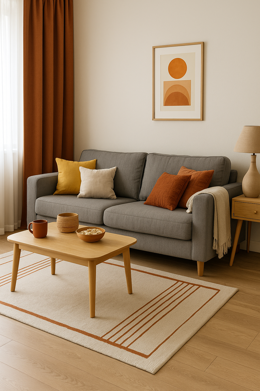 • V obývacím pokoji zvolte větší kusový koberec pod sedačku a konferenční stolek.